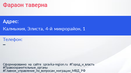 Фараон, таверна по адресу Калмыкия, Элиста, 4-й микрорайон, 1 в дальнейшем Организация, размещена в следующих категориях: