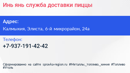Инь янь, служба доставки пиццы по адресу Калмыкия, Элиста, 6-й микрорайон, 24а в дальнейшем Организация, размещена в следующих категориях: