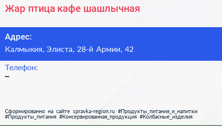 Жар-птица, кафе-шашлычная по адресу Калмыкия, Элиста, 28-й Армии, 42 в дальнейшем Организация, размещена в следующих категориях: