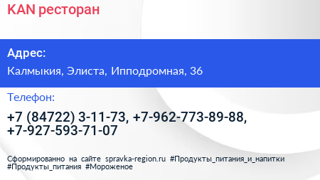 KAN, ресторан по адресу Калмыкия, Элиста, Ипподромная, 36 в дальнейшем Организация, размещена в следующих категориях:
