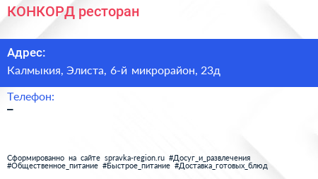 КОНКОРД, ресторан по адресу Калмыкия, Элиста, 6-й микрорайон, 23д в дальнейшем Организация, размещена в следующих категориях: