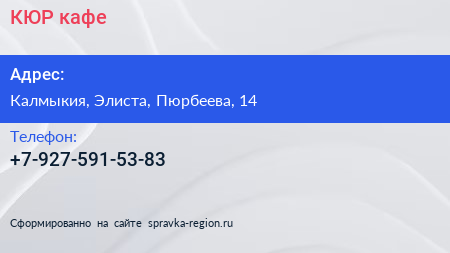 КЮР, кафе по адресу Калмыкия, Элиста, Пюрбеева, 14 в дальнейшем Организация, размещена в следующих категориях: