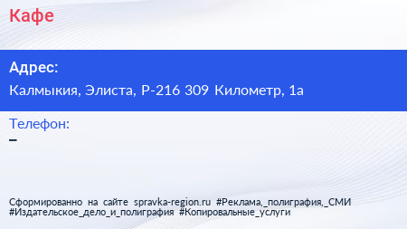 Кафе по адресу Калмыкия, Элиста, Р-216 309 Километр, 1а в дальнейшем Организация, размещена в следующих категориях: