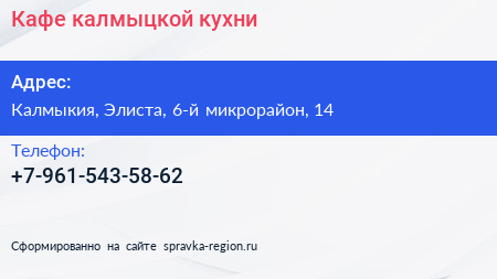 Кафе калмыцкой кухни по адресу Калмыкия, Элиста, 6-й микрорайон, 14 в дальнейшем Организация, размещена в следующих категориях: