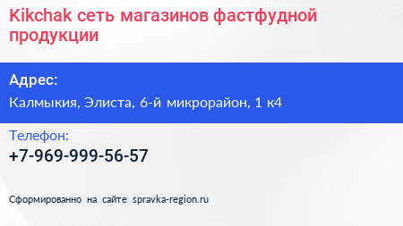 Kikchak, сеть магазинов фастфудной продукции по адресу Калмыкия, Элиста, 6-й микрорайон, 1 к4 в дальнейшем Организация, размещена в следующих категориях: