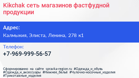 Kikchak, сеть магазинов фастфудной продукции по адресу Калмыкия, Элиста, Ленина, 278 к1 в дальнейшем Организация, размещена в следующих категориях: