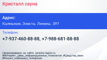 Кристалл, сауна по адресу Калмыкия, Элиста, Ленина, 397 в дальнейшем Организация, размещена в следующих категориях: