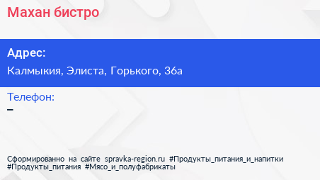 Махан, бистро по адресу Калмыкия, Элиста, Горького, 36а в дальнейшем Организация, размещена в следующих категориях: