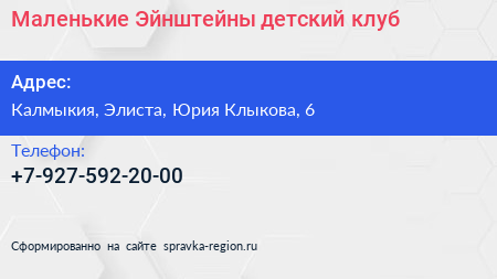 Маленькие Эйнштейны, детский клуб по адресу Калмыкия, Элиста, Юрия Клыкова, 6 в дальнейшем Организация, размещена в следующих категориях: