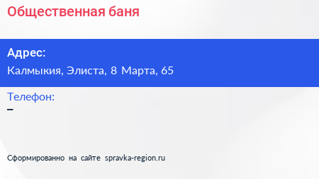Общественная баня по адресу Калмыкия, Элиста, 8 Марта, 65 в дальнейшем Организация, размещена в следующих категориях: