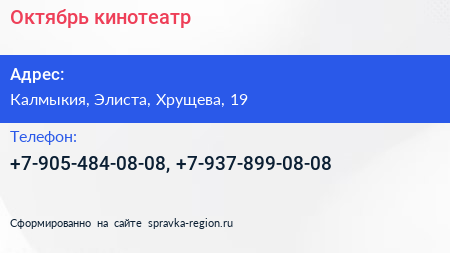 Октябрь, кинотеатр по адресу Калмыкия, Элиста, Хрущева, 19 в дальнейшем Организация, размещена в следующих категориях: