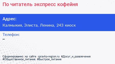 По-читатель, экспресс-кофейня по адресу Калмыкия, Элиста, Ленина, 243 киоск в дальнейшем Организация, размещена в следующих категориях: