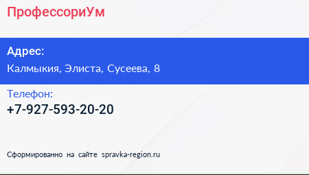 ПрофессориУм по адресу Калмыкия, Элиста, Сусеева, 8 в дальнейшем Организация, размещена в следующих категориях: