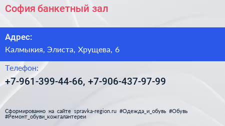 София, банкетный зал по адресу Калмыкия, Элиста, Хрущева, 6 в дальнейшем Организация, размещена в следующих категориях:
