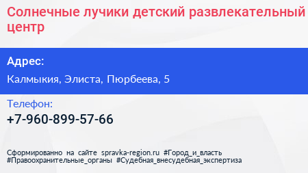 Солнечные лучики, детский развлекательный центр по адресу Калмыкия, Элиста, Пюрбеева, 5 в дальнейшем Организация, размещена в следующих категориях: