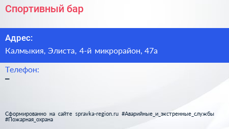 Спортивный бар по адресу Калмыкия, Элиста, 4-й микрорайон, 47а в дальнейшем Организация, размещена в следующих категориях: