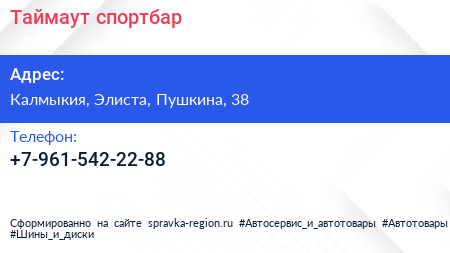 Таймаут, спортбар по адресу Калмыкия, Элиста, Пушкина, 38 в дальнейшем Организация, размещена в следующих категориях: