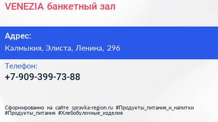 VENEZIA, банкетный зал по адресу Калмыкия, Элиста, Ленина, 296 в дальнейшем Организация, размещена в следующих категориях: