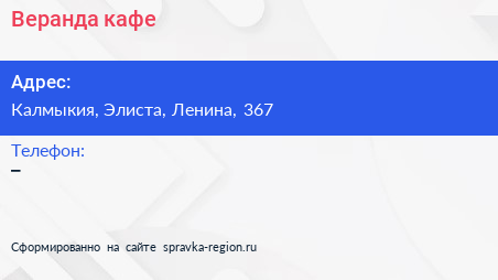 Веранда, кафе по адресу Калмыкия, Элиста, Ленина, 367 в дальнейшем Организация, размещена в следующих категориях: