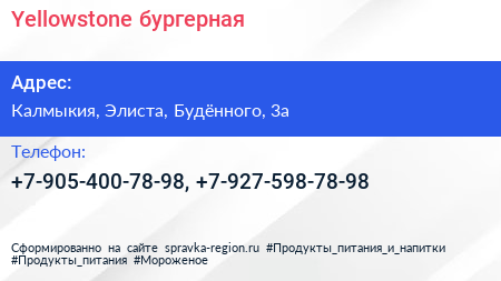 Yellowstone, бургерная по адресу Калмыкия, Элиста, Будённого, 3а в дальнейшем Организация, размещена в следующих категориях: