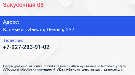 Закусочная 08 по адресу Калмыкия, Элиста, Ленина, 292 в дальнейшем Организация, размещена в следующих категориях: