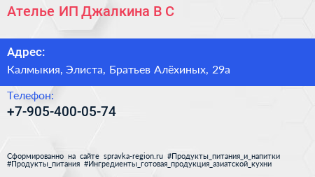 Ателье, ИП Джалкина В.С. по адресу Калмыкия, Элиста, Братьев Алёхиных, 29а в дальнейшем Организация, размещена в следующих категориях: