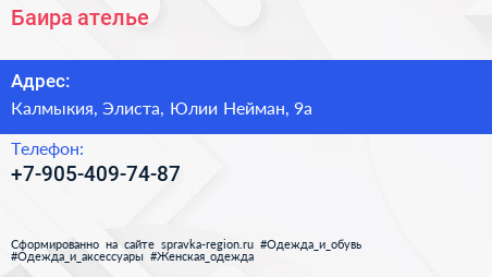 Баира, ателье по адресу Калмыкия, Элиста, Юлии Нейман, 9а в дальнейшем Организация, размещена в следующих категориях:
