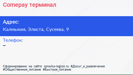 Comepay, терминал по адресу Калмыкия, Элиста, Сусеева, 9 в дальнейшем Организация, размещена в следующих категориях: