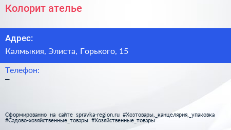 Колорит, ателье по адресу Калмыкия, Элиста, Горького, 15 в дальнейшем Организация, размещена в следующих категориях: