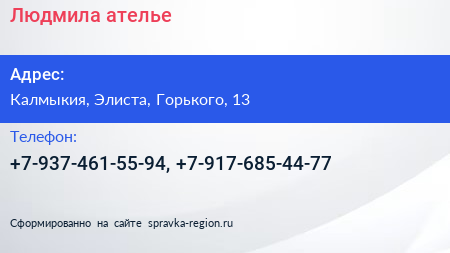Людмила, ателье по адресу Калмыкия, Элиста, Горького, 13 в дальнейшем Организация, размещена в следующих категориях: