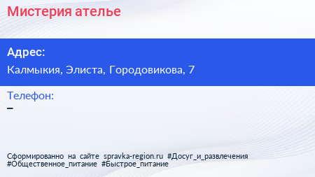 Мистерия, ателье по адресу Калмыкия, Элиста, Городовикова, 7 в дальнейшем Организация, размещена в следующих категориях: