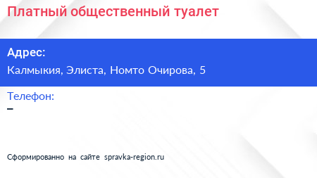 Платный общественный туалет по адресу Калмыкия, Элиста, Номто Очирова, 5 в дальнейшем Организация, размещена в следующих категориях: