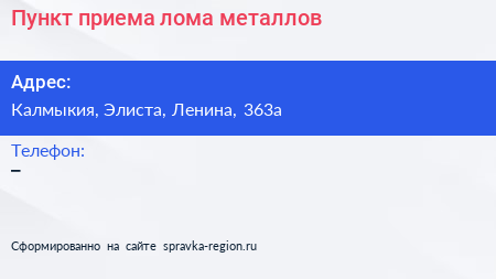 Пункт приема лома металлов по адресу Калмыкия, Элиста, Ленина, 363а в дальнейшем Организация, размещена в следующих категориях: