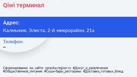 Qiwi, терминал по адресу Калмыкия, Элиста, 2-й микрорайон, 21а в дальнейшем Организация, размещена в следующих категориях: