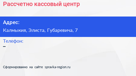 Рассчетно-кассовый центр по адресу Калмыкия, Элиста, Губаревича, 7 в дальнейшем Организация, размещена в следующих категориях: