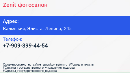 Zenit, фотосалон по адресу Калмыкия, Элиста, Ленина, 245 в дальнейшем Организация, размещена в следующих категориях: