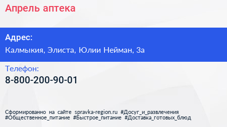 Апрель, аптека по адресу Калмыкия, Элиста, Юлии Нейман, 3а в дальнейшем Организация, размещена в следующих категориях: