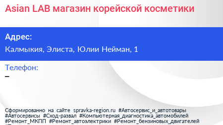 Asian LAB, магазин корейской косметики по адресу Калмыкия, Элиста, Юлии Нейман, 1 в дальнейшем Организация, размещена в следующих категориях: