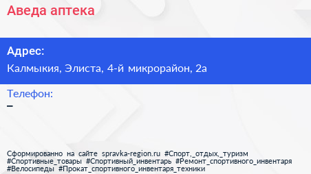 Аведа, аптека по адресу Калмыкия, Элиста, 4-й микрорайон, 2а в дальнейшем Организация, размещена в следующих категориях: