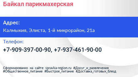 Байкал, парикмахерская по адресу Калмыкия, Элиста, 1-й микрорайон, 21а в дальнейшем Организация, размещена в следующих категориях: