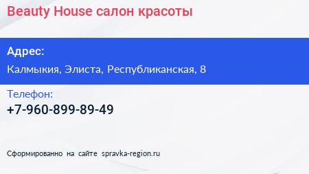 Beauty House, салон красоты по адресу Калмыкия, Элиста, Республиканская, 8 в дальнейшем Организация, размещена в следующих категориях: