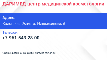 ДАРИМЕД, центр медицинской косметологии по адресу Калмыкия, Элиста, Илюмжинова, 6 в дальнейшем Организация, размещена в следующих категориях: