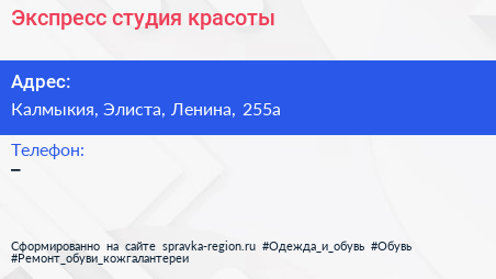Экспресс, студия красоты по адресу Калмыкия, Элиста, Ленина, 255а в дальнейшем Организация, размещена в следующих категориях: