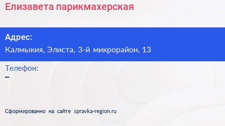 Елизавета, парикмахерская по адресу Калмыкия, Элиста, 3-й микрорайон, 13 в дальнейшем Организация, размещена в следующих категориях: