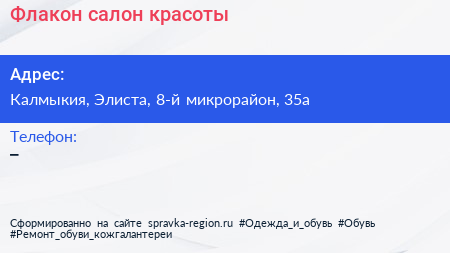 Флакон, салон красоты по адресу Калмыкия, Элиста, 8-й микрорайон, 35а в дальнейшем Организация, размещена в следующих категориях: