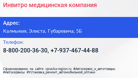Инвитро, медицинская компания по адресу Калмыкия, Элиста, Губаревича, 5Б в дальнейшем Организация, размещена в следующих категориях: