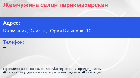 Жемчужина, салон-парикмахерская по адресу Калмыкия, Элиста, Юрия Клыкова, 10 в дальнейшем Организация, размещена в следующих категориях: