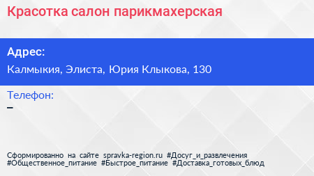 Красотка, салон-парикмахерская по адресу Калмыкия, Элиста, Юрия Клыкова, 130 в дальнейшем Организация, размещена в следующих категориях: