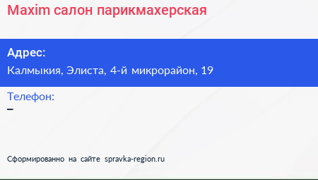 Maxim, салон-парикмахерская по адресу Калмыкия, Элиста, 4-й микрорайон, 19 в дальнейшем Организация, размещена в следующих категориях: