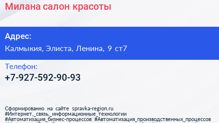 Милана, салон красоты по адресу Калмыкия, Элиста, Ленина, 9 ст7 в дальнейшем Организация, размещена в следующих категориях: